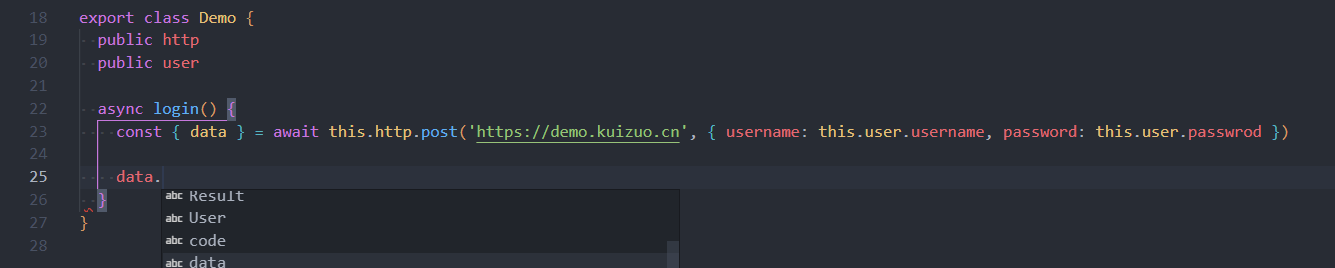这是一个 post 请求用于实现登录的,但是这个响应数据 data 没有任何具体提示(这里的提示是 vscode 记录用户常输入的提示),这时候如果一旦拼接错误,就会导致某个数据没拿到,从而诱发 bug。同理提交的请求体 body 不做约束,万一这个请求还有验证码 code 参数,但是我没写上,那请求就会失败,这是就需要通过调试输出,甚至需要抓包比对原始数据包才能得知。